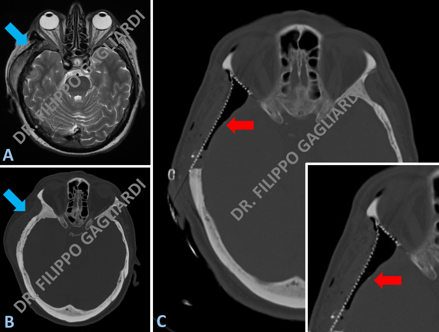 Caso di meningioma sfeno-orbitario destro (frecce azzure Figure A e B). Il tumore infiltra diffusamente il muscolo temporale (muscolo masticatorio localizzato a livello della tempia) (freccia azzurra Figura A), l’osso della volta cranica lateralmente e la parete laterale dell’orbita (freccia azzurra Figura B). La TC post-operatoria documenta l’asportazione completa del meningioma con la decompressione dell’occhio destro e la ricostruzione del profilo del cranio e dell’orbita con una mesh (rete) in titanio (frecce rosse Figura C).