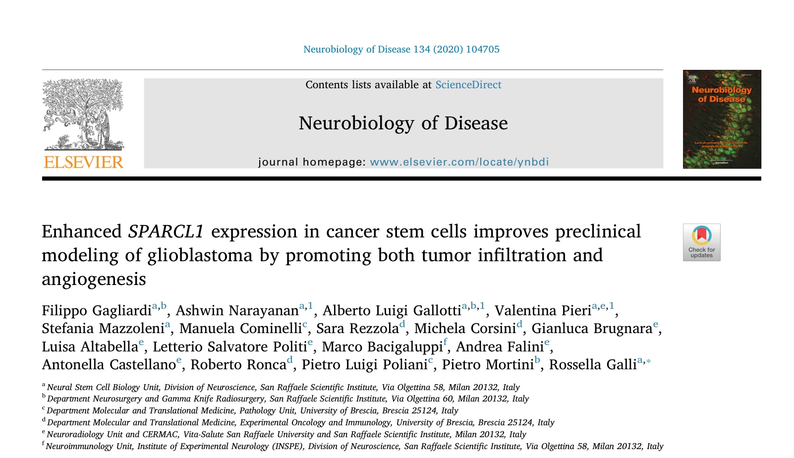 Il Dottor Gagliardi collabora attivamente da anni con la Dottoressa Rossella Galli. Focus sulla caratterizzazione molecolare delle cellule staminali tumorali da glioblastoma, per identificare nuovi bersagli terapeutici che curino queste malattie. Di seguito una pubblicazione su una grossa rivista americana sulla identificazione di un nuovo marcatore coinvolto nell'angiogenesi tumorale.