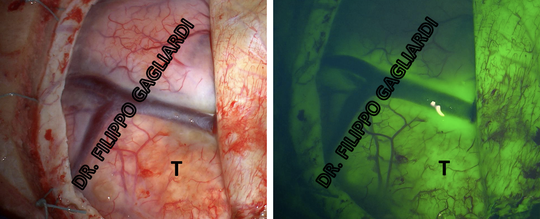 La sonda Doppler consente di valutare la presenza di flusso all'interno di un vaso. Funziona come la sonda che si applica nel collo per il eco-Doppler dei tronchi sovra-portici, esame di routine. L'utilizzo della fluoresceina intravascolare consente, invece, di visualizzare la presenza di flusso nei vasi dopo l'esclusione di un aneurisma dal circolo. Questo intervento viene realizzato con un microscopio operatorio dotato di filtri dedicati. L'aneurisma, se ben trattato, risulterà non colorarsi dopo iniezione del contrasto fluorescente, invece i vasi normali attorno ad esso presenteranno un regolare flusso. In conclusione queste metodiche trovano il loro utilizzo nel monitorare la preservazione del flusso sanguigno all’interno di un’arteria. Questo si verifica durante le tecniche di esclusione di un aneurisma cerebrale e di una malformazione vascolare. Così facendo si riesce a prevenirne la chiusura e le conseguenze ischemiche (ictus) da essa generate. Di seguito il caso di utilizzo della fluorescenza nell'exeresi di un tumore (T) attaccato ad una importante struttura venosa (vena corticale).
