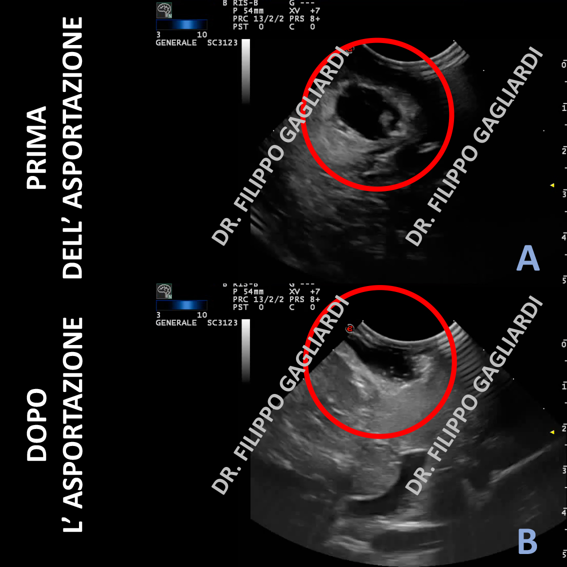 La foto rappresenta la scansione ecografica prima (Figura A) e dopo (Figura B) l’asportazione di un tumore al cervello (cerchio rosso).