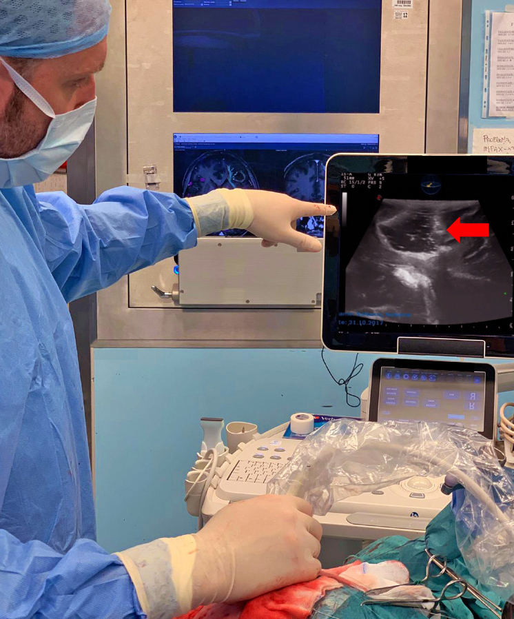 Nella foto si vede l’utilizzo dell’ecografia intraoperatoria. Il Dr. Gagliardi al termine dell’exeresi del tumore verifica con l’ecografo l’asportazione totale della massa (freccia rossa).