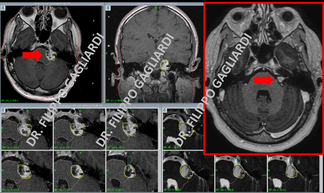 Caso di neurinoma dell’VIII nervo cranico di sinistra trattato con radiochirurgia stereotassica in una donna giovane venuta all’attenzione per un calo progressivo dell’udito. La freccia rossa in alto a sinistra mostra le lesione il giorno del trattamento. La lesione è contornata da una linea gialla che corrisponde alla visualizzazione della geometria del campo di radiazione. Come si può vedere la radiazione è estremamente conformata, il che significa che riproduce in modo quasi perfetto la geometria del tumore minimizzando la dose ai tessuti circostanti. Nel riquadro in rosso si vede la RM di controllo della Paziente a 4 anni dal trattamento: la lesione è praticamente scomparsa (freccia rossa in alto a destra). La Paziente non ha presentato alcuna complicanza.