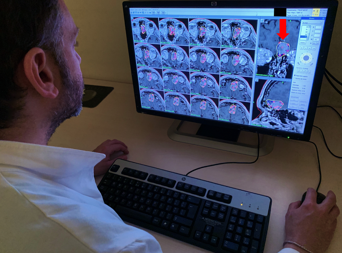 Nella foto si vede li Dr. Gagliardi durante la preparazione di un piano di trattamento Gamma Knife. La lesione è contornata da una linea gialla che corrisponde alla visualizzazione della geometria del campo di radiazione (freccia rossa). Di seguito un caso clinico.
